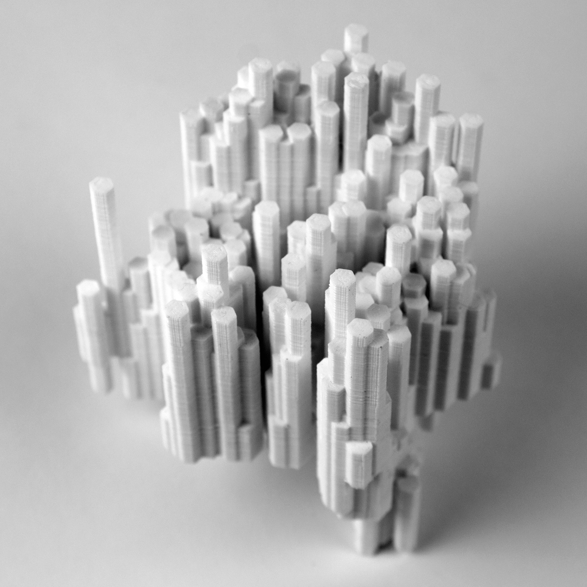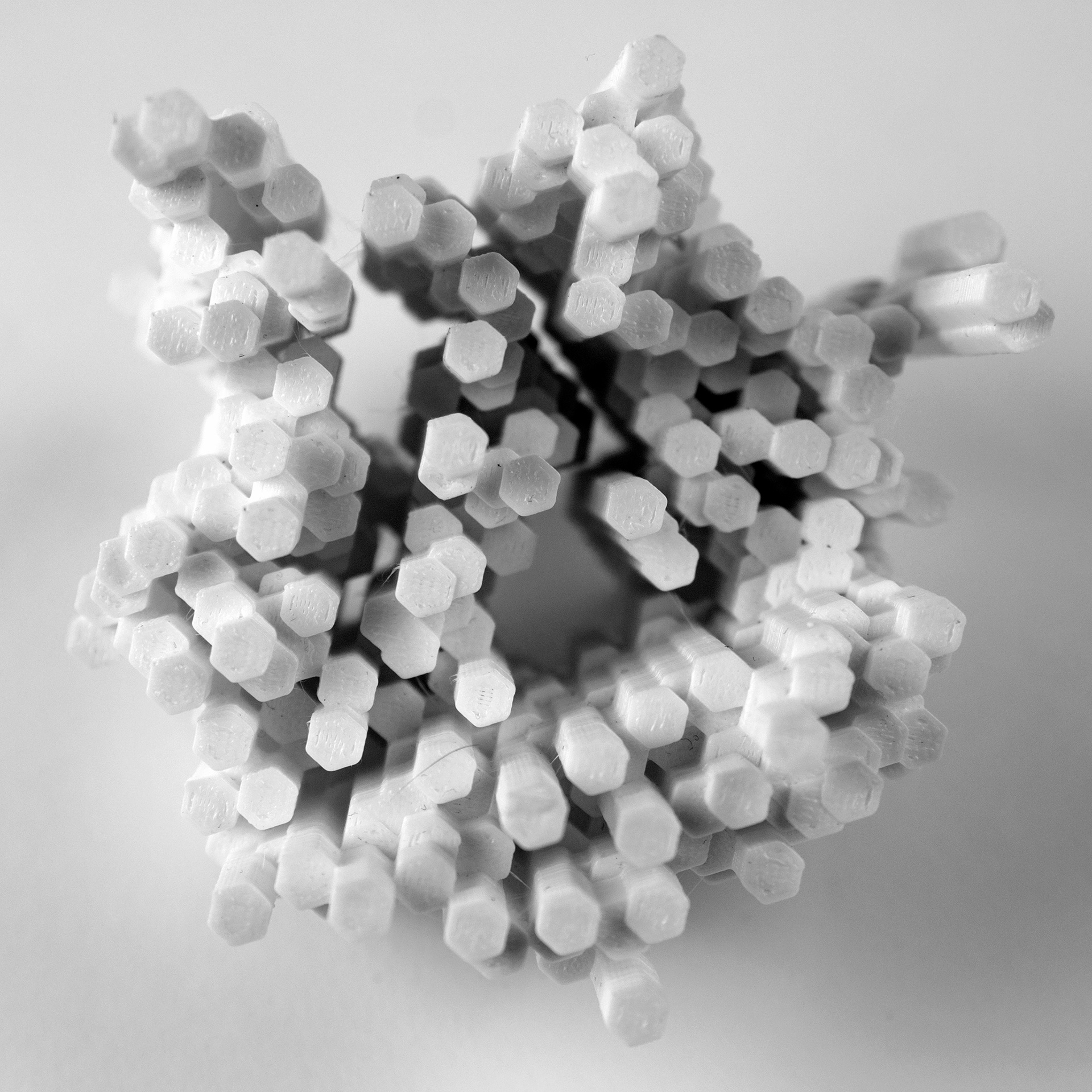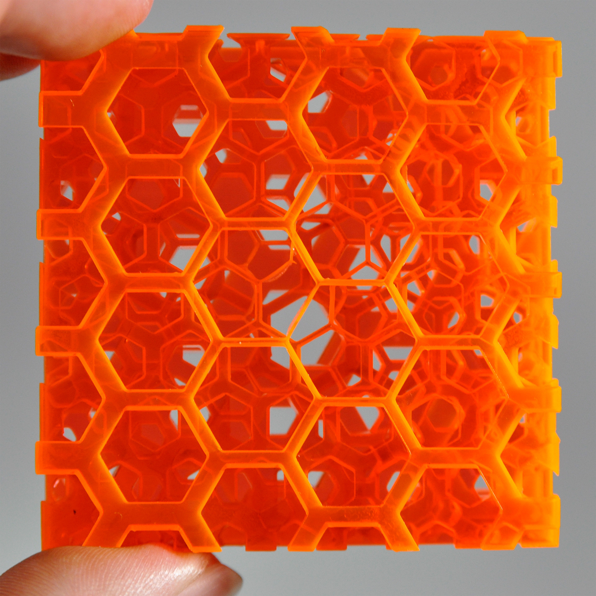 Objects created using digital fabrication methods including laser cutting and 3D printing.