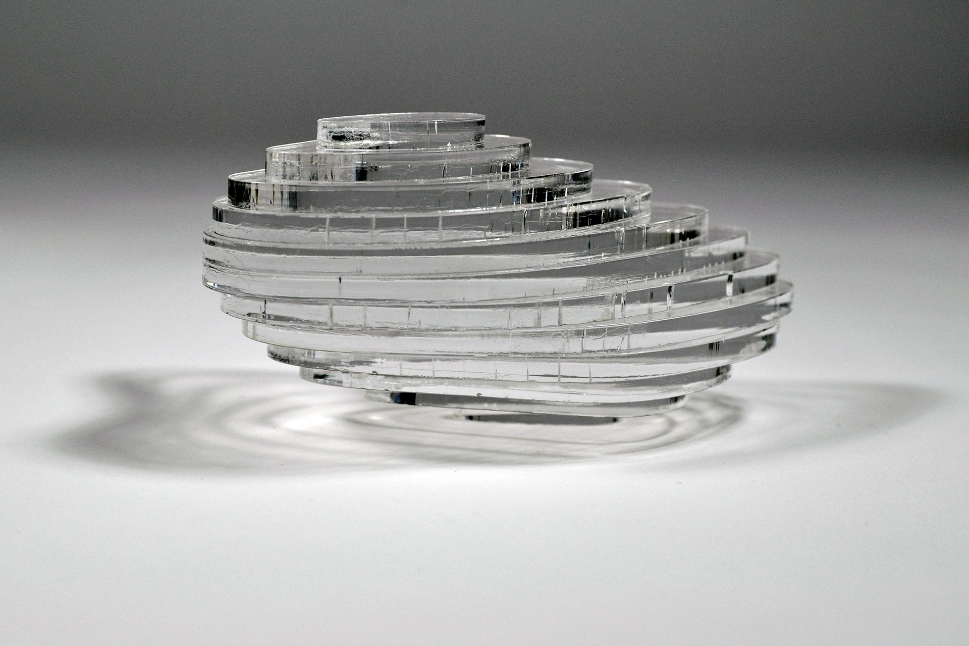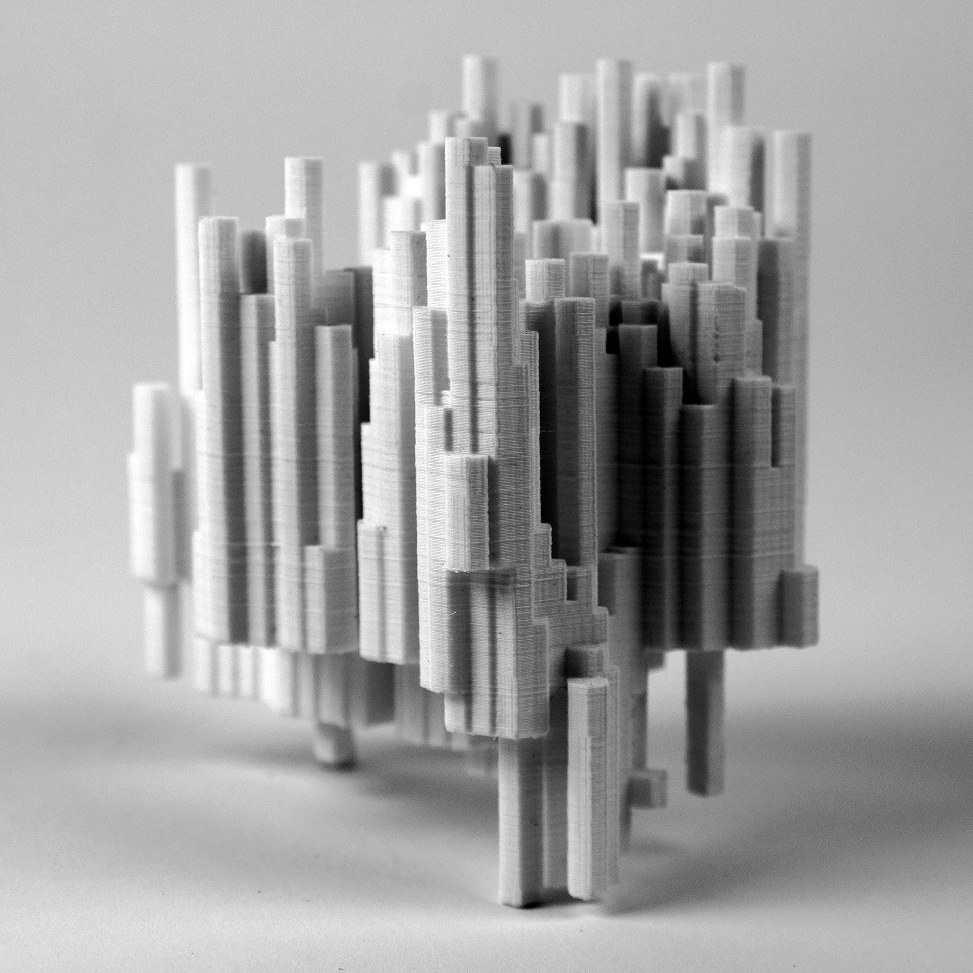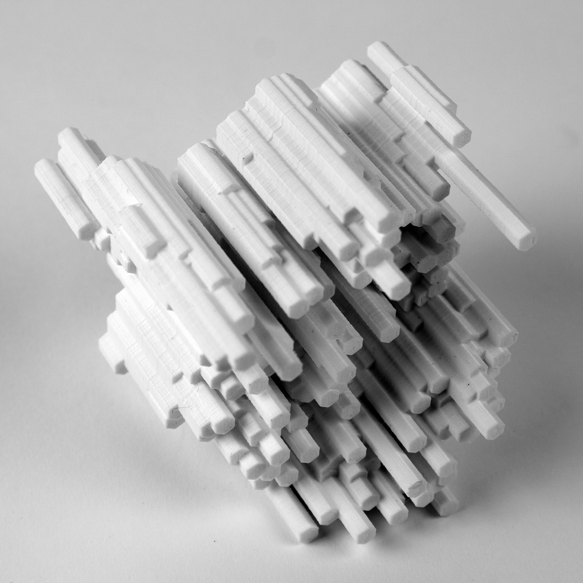 Objects created using digital fabrication methods including laser cutting and 3D printing.